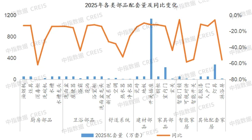 2025年,家居七大部品整体配套规模同比下降15.3%。其中配套量最高的建材部品,配套量达1250万套,同比下降11.9%,其他部品均同比下降,舒适系统同比降幅最大,达36.3%。