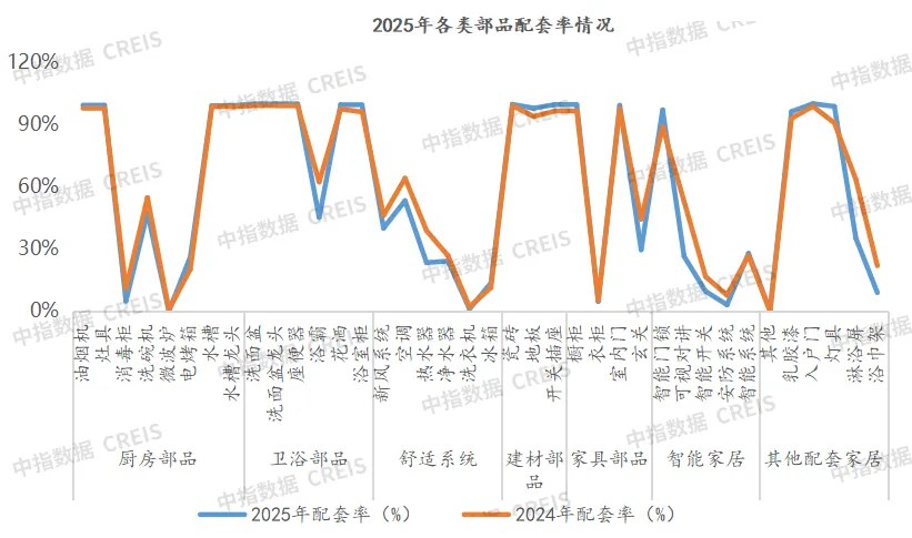 2025年,精装修楼盘中的基础部品配套率均超过90%,属于标配产品。如厨房中的水槽、水槽龙头、烟机灶具,卫浴部品中的花洒、浴室柜、洗面盆、洗面盆龙头、坐便器,建材部品的瓷砖、地板、开关插座,家具部品中的橱柜、室内门,其他配套家居中的入户门、乳胶漆、灯具等配套率均超过90%,这些是精装修项目中的必备部品。