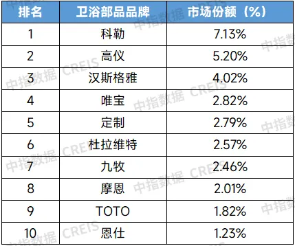 2025年,科勒稳居卫浴部品市占率榜首,占7.13%,市占率同比下降7个百分点。其次是高仪和汉斯格雅,市占率分别为5.2%和4.02%。前三品牌合计占比16.35%。