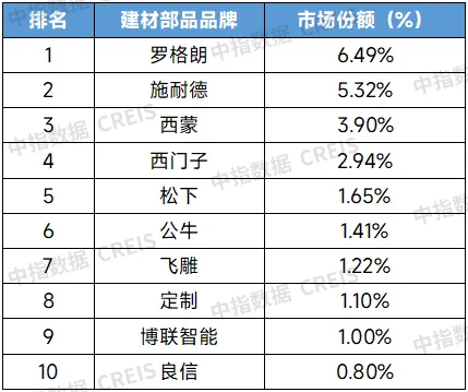 2025年建材部品中,品牌市占位列前三名的分别是罗格朗、施耐德和西蒙,合计占比15.7%,前三品牌合计占比较去年同期下降2.83个百分点