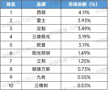 2025年,其他配套家居品牌市占位居前三的是西顿、雷士和定制品牌,合计占比达11.5%。