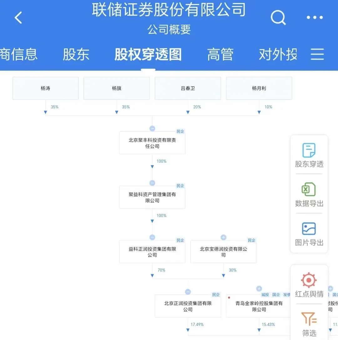 杨涛主要通过北京聚丰科投资有限责任公司控制登云股份,而联储证券的第一大股东北京正润投资集团有限公司(17.49%)的控股方向上同样可以追溯到北京聚丰科投资有限责任公司。