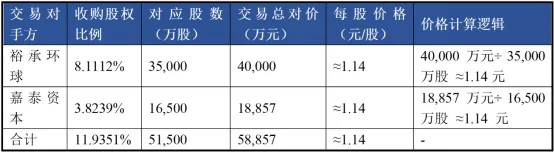 本次交易分两笔进行,两笔交易的每股价格一致,约1.14元。