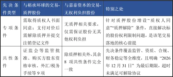 本次两笔交易的流程核心差异源于标的股份是否存在质押,裕承环球转让的 8.1112%股权处于质押状态,而嘉泰资本转让的3.8239% 股权无任何权利负担,导致交易流程设计呈现“差异化”,尤其是先决条件和交割环节。