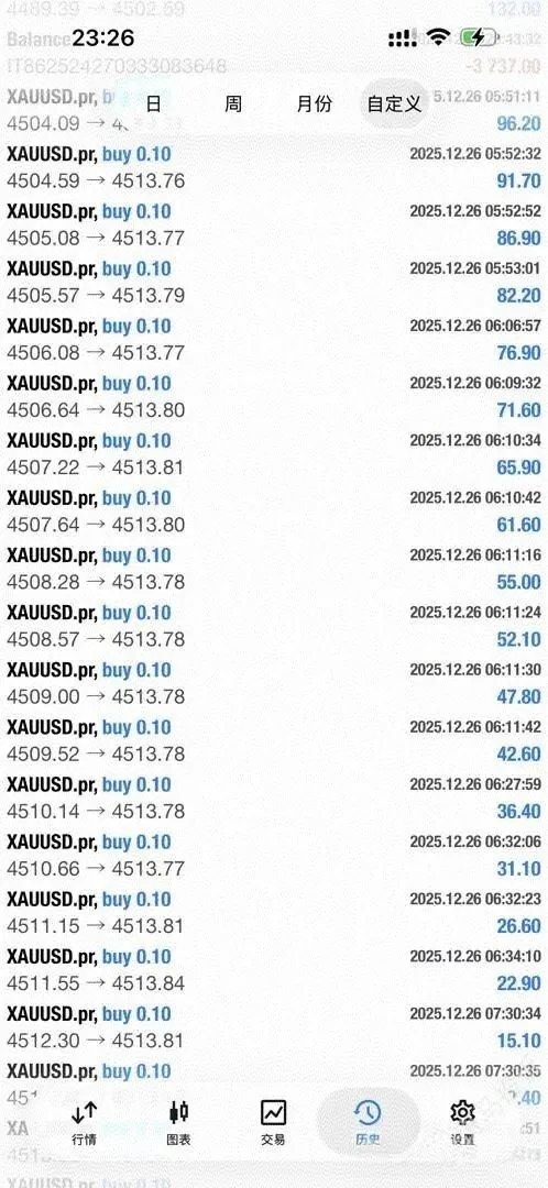 对此,A某解释称,其订单大部分持仓时间在10分钟以上,且多为0.1手的小单,平仓时使用了“一键平仓”功能,因此产生了密集的平仓记录。A某展示的交易策略是:黄金每涨0.1美元加仓一次,导致一个账户出现多个小单子。