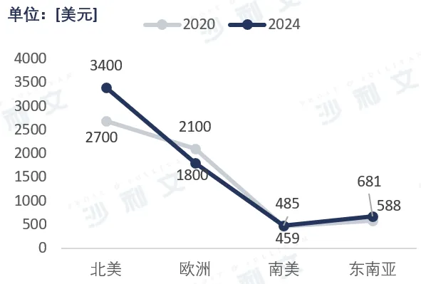 全球线上零售额及在整体零售中的占比稳步增长,为跨境电商创造有利土壤。从2020年至2024年,北美地区跨境电商平均客单价由2,700美元上升至3,400美元,体现出高价值市场消费能力的持续增强;欧洲由2,100美元降至1,800美元,虽有回落,但部分源于中低价产品的渗透率提升与消费者价格敏感度上升,显示出市场结构调整的特征;南美由485美元降至459美元,整体规模较小但保持相对稳定,仍具增长潜力;东南亚由681美元降至588美元,虽短期承压,但随着基础设施改善与消费升级,该区域未来仍具弹性空间。整体来看,北美市场呈稳健增长,其他新兴市场则处于消费结构优化与价格再平衡阶段。