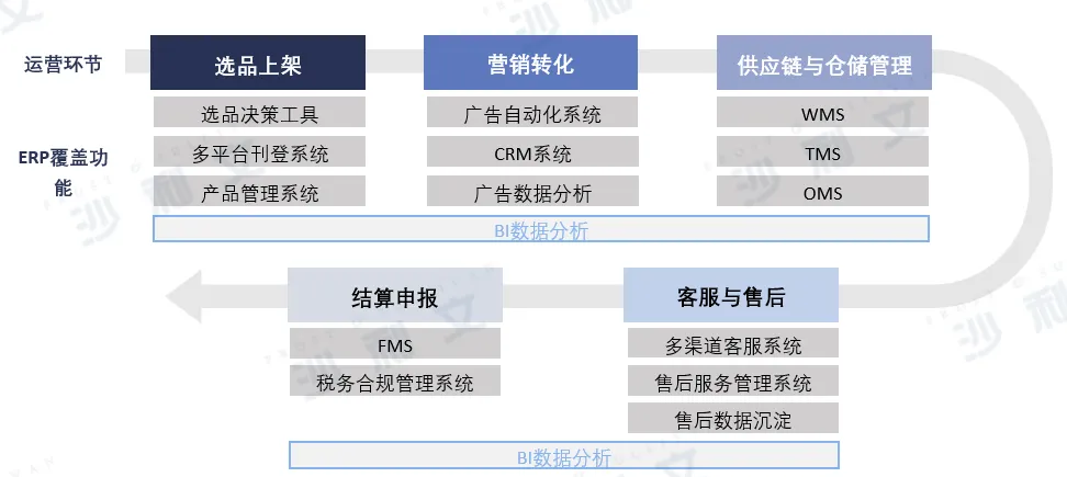 ERP贯通跨境电商经营链路,高度集成卖家在各环节所需SaaS工具,提供一体化业务管理平台。ERP核心价值在于围绕选品上架、营销转化、供应链与仓储管理、客服与售后、结算申报等经营环节打通各数据链路,协同运作各功能模块,构建高效一体的全流程管理体系。