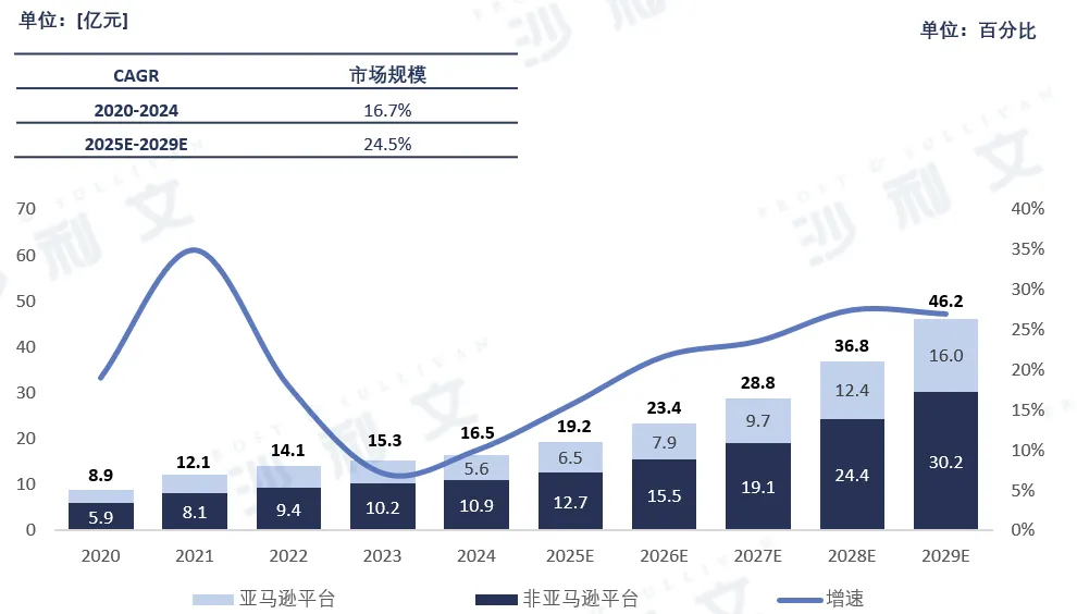 跨境电商平台市场规模由2020年的8.9亿元增至2024年的16.5亿元,复合年均增长率16.7%;亚马逊平台市场规模由3.0亿元增至5.6亿元;整体市场预计2025–2029年将以24.5%的年均增速提升,至2029年达到46.2亿元。亚马逊平台将由6.5亿元增至16.0亿元,非亚马逊平台由12.7亿元增至30.2亿元,非亚马逊平台占比持续提升。行业增长动力由从单一依赖亚马逊平台到转向由多全球多平台、多市场共同驱动。Temu、TikTok Shop、SHEIN等新平台快速崛起,吸引了大量流量和卖家。卖家为了抓住新流量红利,开始同时运营多个平台,这使得能够集成管理多平台的ERP从“可选项”变成了“刚需”。
