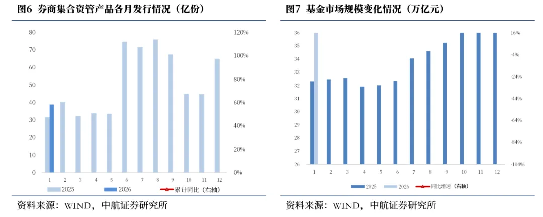 截至2026年1月23日,2026年券商资管累计新发行份额38.79亿份,新成立基金222只。2025年12月共计新发资管产品725只,同比+169.52%,共计市场份额64.68亿份,同比上涨125.29%。截至2026年1月23日,基金市场份额32.03万亿份,实现基金规模37.51万亿元。