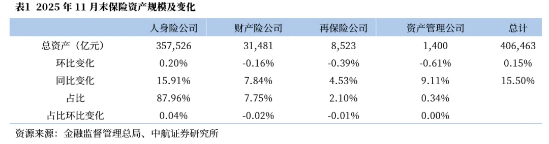 截至2025年11月,保险公司总资产为40.65万亿元,环比+0.15%,同比+15.50%。其中人身险公司总资产35.75万亿元,环比+0.20%,同比+15.91%,占总资产的比重为87.96%;财产险公司总资产3.15万亿元,环比-1.16%,同比+7.84%,占总资产的比重为7.75%。