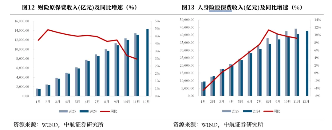 原保费收入: 2025年11月,全行业共实现原保险保费收入57,628.81亿元,同比+7.56%。其中,财产险业务原保险保费收入13,423.06亿元,同比+2.48%;人身险原保费收入44,205.74亿元,同比+9.20%。