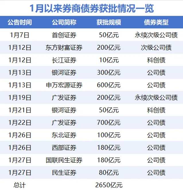 除上述案例外,1月26日,西部证券、东北证券发布公告,均获中国证监会批复发行公司债,额度分别不超过180亿元、100亿元。另外,1月23日,广发证券获准发行不超过700亿元公司债,成为年初以来单笔获批发债额度最高的上市券商。综合来看,据公司公告统计,仅1月以来,就有10家券商先后获批合计2650亿元公司债(含次级公司债、永续次级公司债、科技创新公司债),为后续融资落地提前“备足弹药”。
