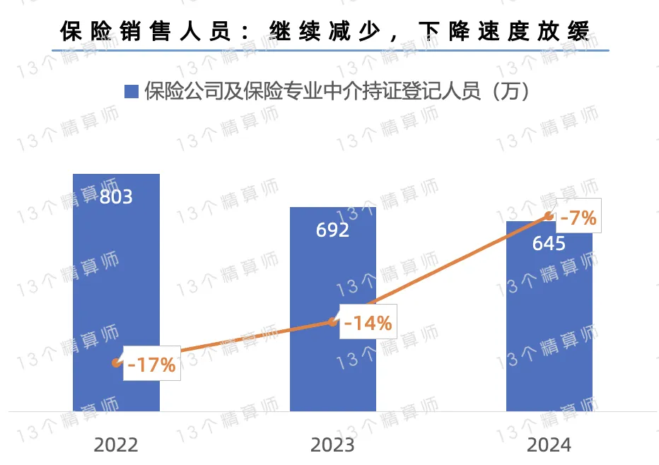 近三年,保险销售人员仍持续减少,但是,从下降速度看已经明显放缓,2024年降幅已经降至个位数。