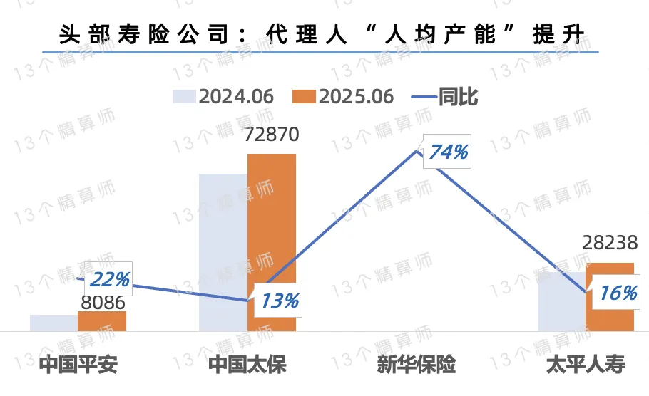 与此同时,2025年上半年,头部寿险公司代理人渠道的产能,也是持续增长,详见上图。