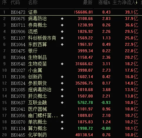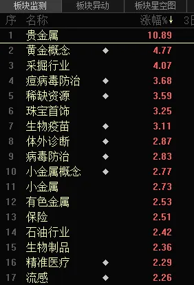 在整体调整的市况下,以贵金属小金属为首的资源板块,病毒防治、金融等板块涨幅居前。