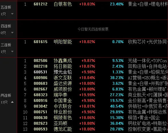 白银有色作为板块高度龙头,成功晋级5连板,盛达资源、铜陵有色等多只个股实现2连板。这表明资源股的炒作已从单纯的期货价格映射,进入到由龙头带动的板块内个股轮番补涨的阶段。