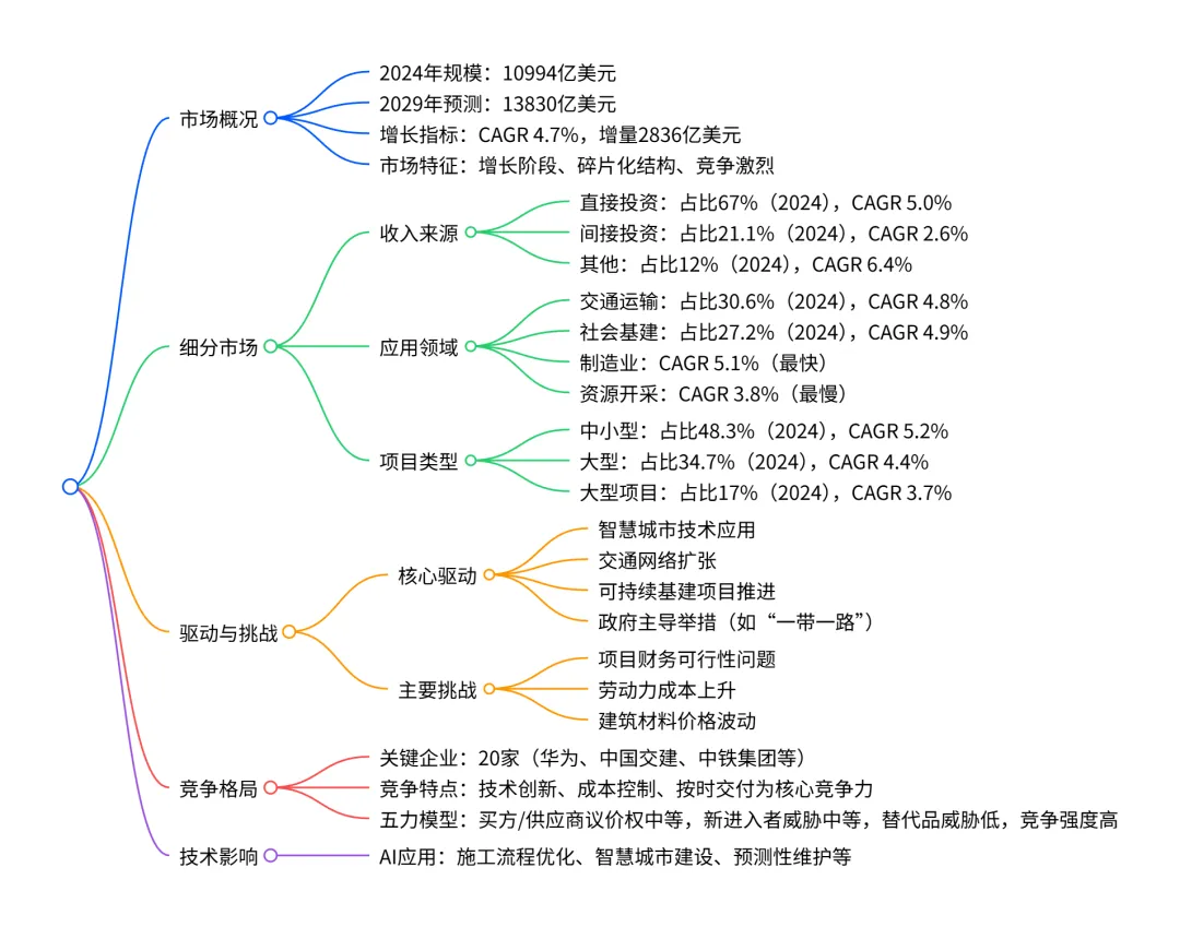 问题:中国基础设施市场的竞争格局有何特点?核心参与企业的类型的和优势是什么?答案:竞争格局特点为 “高竞争强度 + 碎片化结构”,市场有利指数 0.5(2024-2029)。核心参与企业共 20 家,以中国本土企业为主(如中国交建、中铁集团),兼具国际企业(如思科、爱立信);类型包括基建施工企业(中国建筑)、能源基建企业(中国石油)、技术解决方案提供商(华为);优势集中在技术创新(华为 5G)、项目执行能力(中国交建的大型工程经验)、政策资源整合(国企主导的政府项目)。