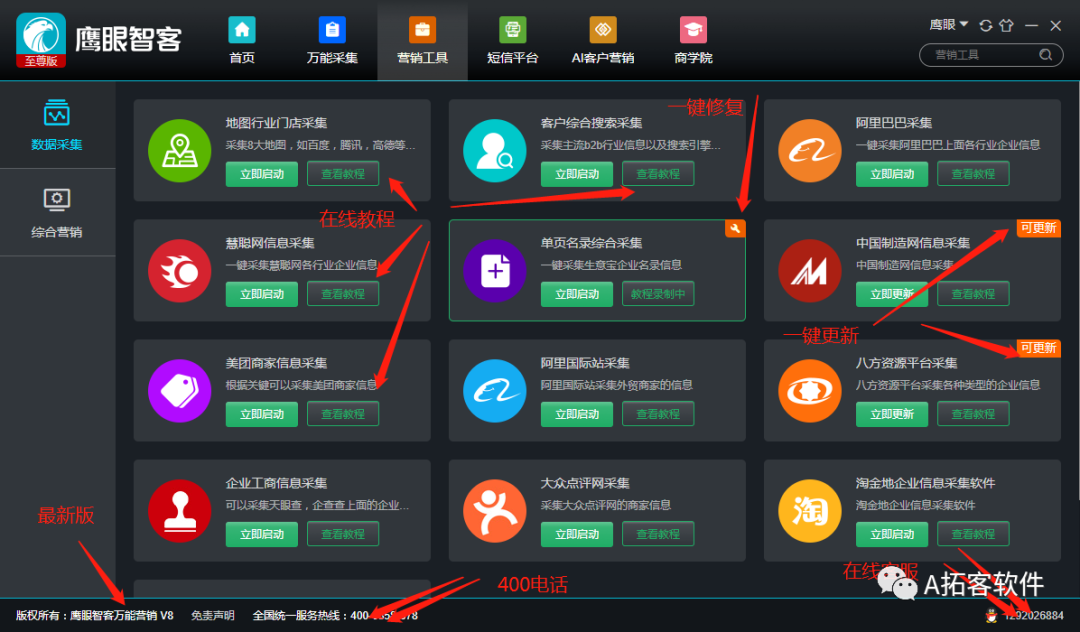 客源采集:设置关键词、地区,全国各地、各行各业的生产、批发、零售、实体商户、企业公司等等的信息,一键获取!