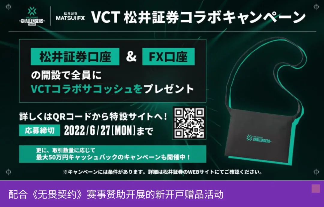 松井证券对电竞的赞助开始于2022年。2022年3月,公司赞助了全球热门FPS游戏《无畏契约》的赛事“无畏契约冠军巡回赛”,并在2022至2024年持续三年担任赞助商。