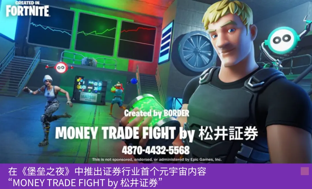 公司也在元宇宙领域早早展开尝试。2024年8月,他们在《堡垒之夜》中推出了原创元宇宙玩法“MONEY TRADE FIGHT by 松井证券”。这是借助《堡垒之夜》“岛屿”的编辑功能开发的独立游戏内容,通过该功能,玩家可以使用外部工具自创关卡。