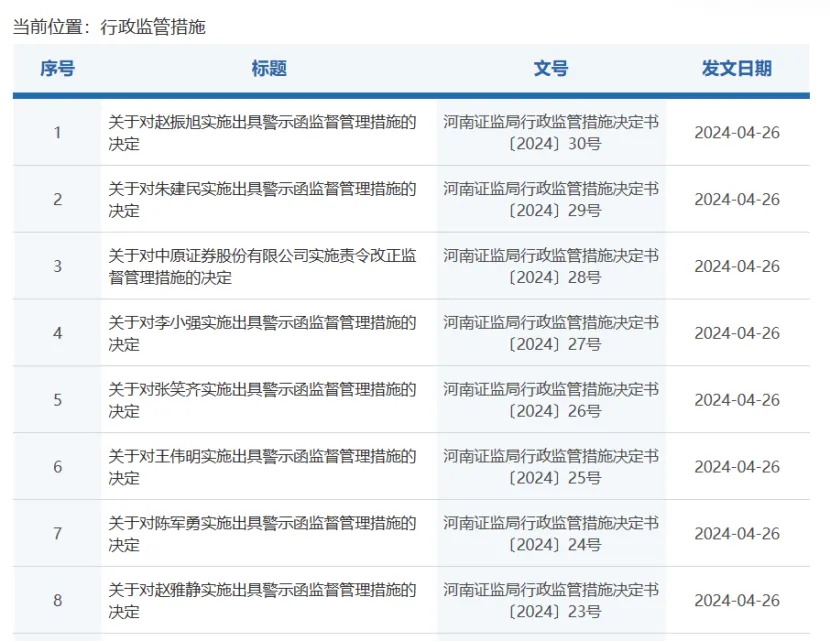 4月26日,河南证监局挂出8张罚单,剑指中原证券存在五大违规情形,七位相关负责人也领罚。