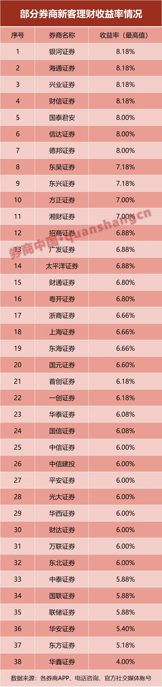 券商中国记者梳理了近40家券商的新客理财产品发现,年化收益率普遍在5%以上。其中,有32家在6%及以上,银河证券、海通证券、兴业证券、财信证券可达到8.18%,国泰君安为8%,东兴证券为7.18%。