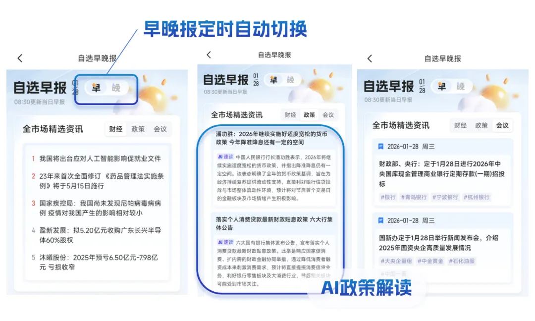 聚焦财经新闻、重大政策、重要会议三大核心领域,为金融机构提供盘前关键参考。针对重大政策板块,AI会进行深度拆解与解读,明确标注政策影响的关联行业。