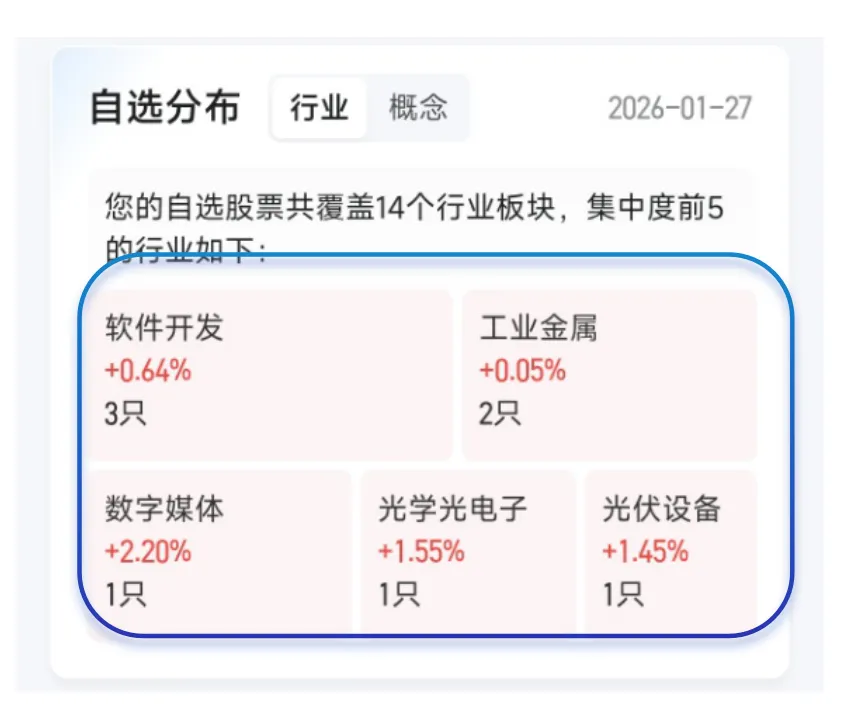 支持行业与概念随时切换,用户可清晰查看自选股票覆盖的行业板块情况,集中度前 5 的行业会重点展示;