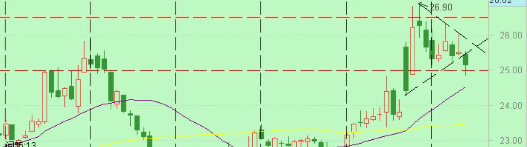 阴跌一天,下探前高顶部区域,尾盘拉上均价,收25上方。