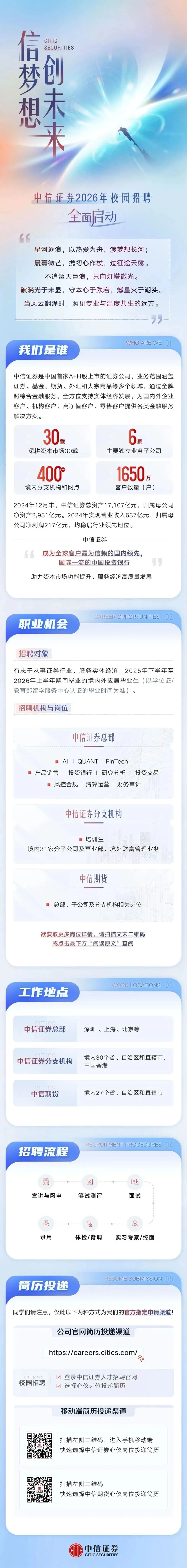 中信证券2026年校园招聘已启动|金融券商关注左上方蓝字“志哥来啦”,每天获取一手就业信息。【招聘资讯】*本文转载自公众号“中信证券”如有侵权,请联系删除如果你想要了解更多就业资讯请扫描下方二维码即可获取最新【招聘信息/求职资料】