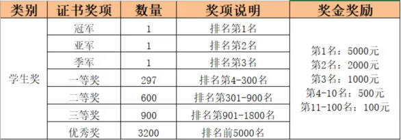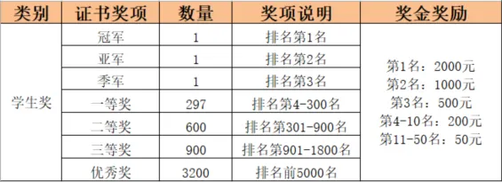 冠军5000元+证书+券商总部游学/实习,亚军2000元+同款游学/实习机会,季军1000元+同款游学/实习机会,第4-10名获得500元奖金及一等奖证书,第11-100名获得100元奖金及一等奖证书。