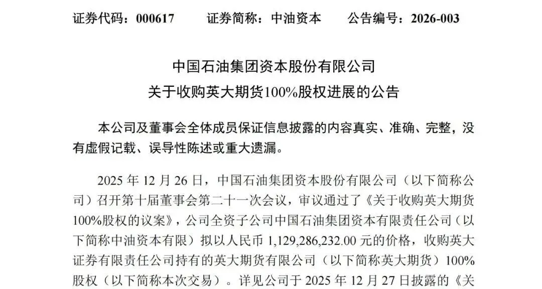 《关于收购英大期货100%股权进展的公告》显示,2025年12月26日,中油资本召开第十届董事会第二十一次会议,审议通过了《关于收购英大期货100%股权的议案》,公司全资子公司中油资本有限责任公司拟以人民币11.29亿元的价格,收购英大证券有限责任公司(以下简称“英大证券”)持有的英大期货100%股权。近日,中油资本接到通知,本次交易已取得国务院国有资产监督管理委员会的批准。