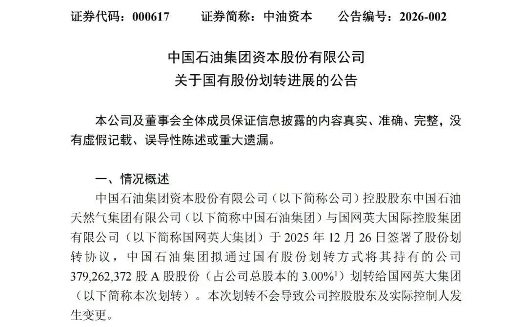 《关于国有股份划转进展的公告》显示,中油资本控股股东中国石油集团与国网英大集团于2025年12月26日签署了股份划转协议,中国石油集团拟通过国有股份划转方式将其持有的公司3.79亿股A股股份(占公司总股本的3.00%)划转给国网英大集团。