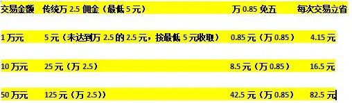 用传统的万2.5佣金(最低5元起收)和万0.85免五做了一个表格,大家对比一下: