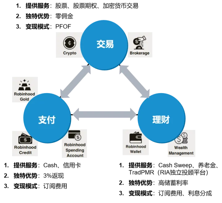 Robinhood在产品上开发出交易、理财、支付三大核心功能,满足客户不同需求,并在各领域都有明确的变现模式,这对它的财报增色不少,并开始往多元综合金融平台发展的道路上走。