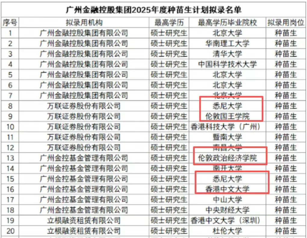 而且这些机构大多有海外业务,特别喜欢招熟悉海外金融市场的海归硕,去年广州金控的录取名单里,全是伦敦国王学院、悉尼大学这些海外名校的孩子。