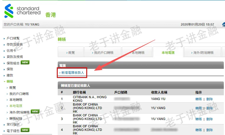 登录香港渣打官网,选择【转账】—【本地电汇】,点击【新增电汇收款人】。