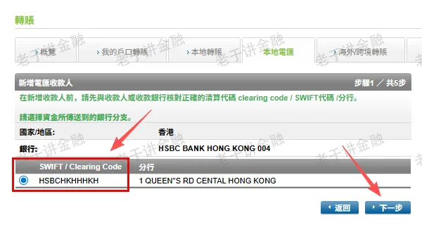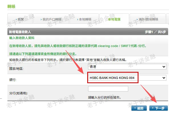 国家和地区选择【香港】,银行选择【HSBC BANK HONG KONG 004】,点击下一步。