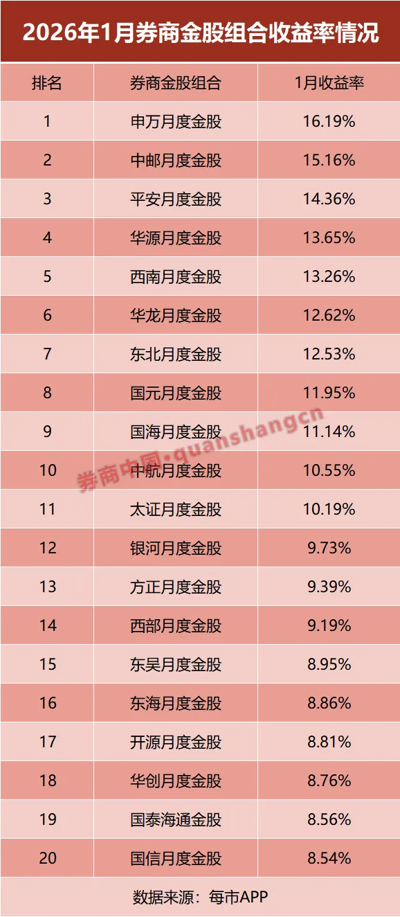 券商金股组合也在1月展现了亮眼的超额收益能力。每市APP数据显示,共有11家券商金股组合在1月涨超10%,显著跑赢大盘指数(上证指数、沪深300在1月分别涨3.76%、1.65%)。