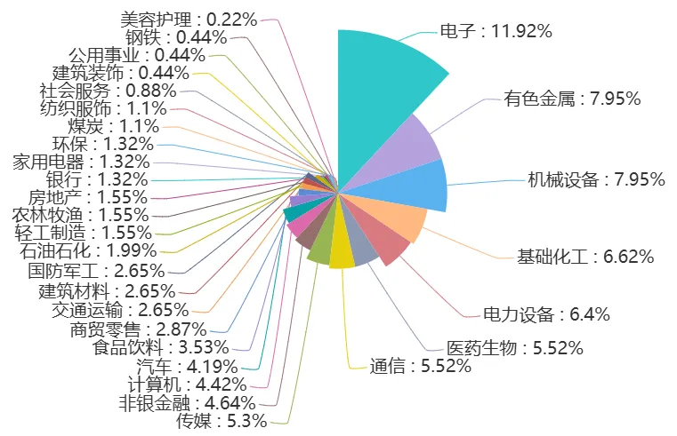电子行业依然雷打不动断层第一,AI叙事及国产替代的大背景下,电子行业的地位很难撼动;有色金属本月冲至第二,金属的叙事已然转变为主权对资源的掌控度;机械设备本月并列第二,但拆分成分看来,涉及半导体业务的机械公司占据半壁江山;伴随着化工品涨价潮,基础化工本月来到第五。