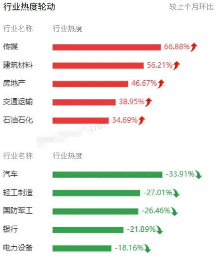 游戏收入高增叠加AI应用,使得本月传媒板块热度提升近7成;建筑材料本月提升超5成,受益于中国巨石的集中推荐;三道红线政策转向推动房地产板块反弹;航运运力紧张叠加春运临近,交运本月热度提升近4成;石油石化则受益于近期国际油价大幅反弹,本月热度提升34%。