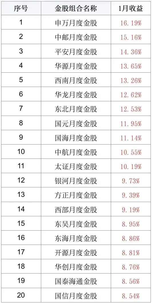 从机构组合的整体表现来看,申万宏源月度金股组合以16.19%的月涨幅排名第一,该券商1月推荐的10只金股中有7只单月涨逾17%。中邮证券月度金股组合以15.16%的涨幅排名第二;平安证券、华源证券、西南证券、华龙证券、东北证券金股组合也在1月获得超10%的月度收益率。