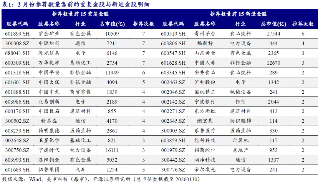 2月份紫金矿业、中际旭创、海光信息、万华化学、贵州茅台、福斯特、山东黄金等金股推荐次数靠前。2月份券商金股已经陆续发布,我们统计了全市场38家券商发布的金股,去重后金股数量合计为291只。我们按照相对上月是否新进,将全体金股分为新进金股和重复金股两类。在重复金股中,2月份推荐次数靠前的金股为:紫金矿业(7次)、中际旭创(7次)、海光信息(7次)、万华化学(7次)、中国平安(6次)等;在新进金股中,2月份推荐次数靠前的金股为:贵州茅台(6次)、福斯特(4次)、山东黄金(3次)、中国人寿(3次)、安井食品(2次)等。