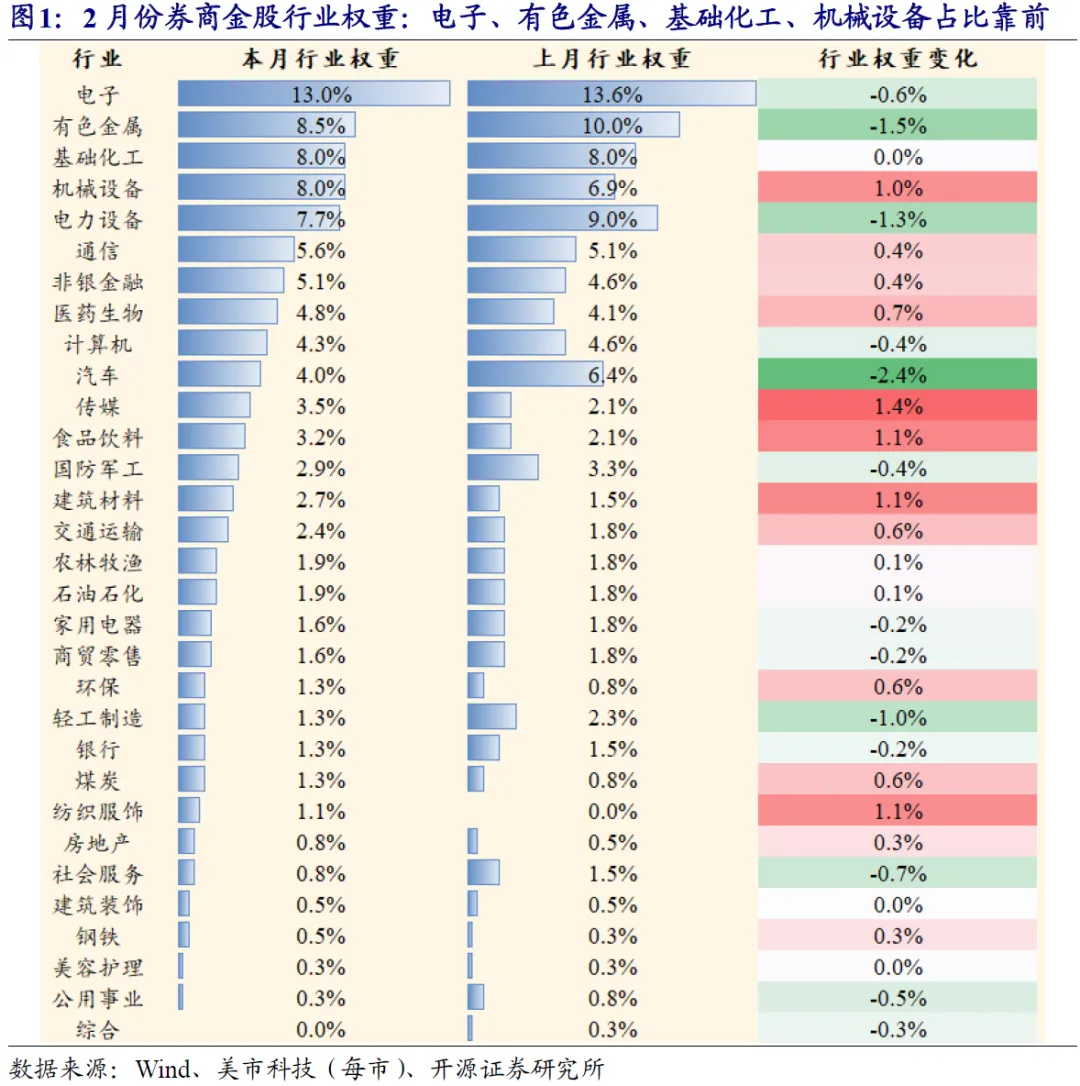2月份电子、有色金属、基础化工、机械设备等行业金股数量占比靠前。2月份金股权重靠前的行业分别为:电子(13.0%)、有色金属(8.5%)、基础化工(8.0%)、机械设备(8.0%)。相比于上月,本月权重增加最多的行业为:传媒(+1.4%)、食品饮料(+1.1%)、建筑材料(+1.1%);权重减少最多的行业为:汽车(-2.4%)、有色金属(-1.5%)、电力设备(-1.3%)。