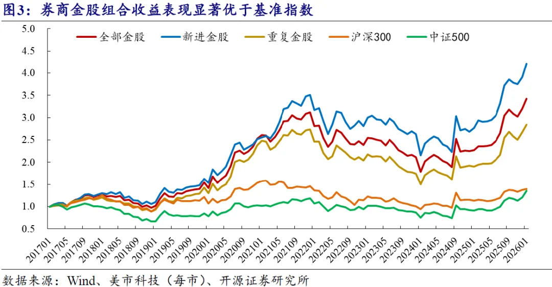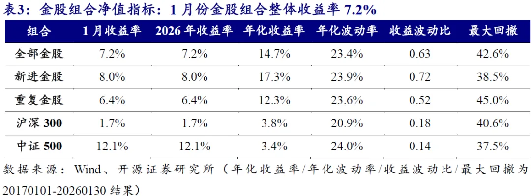 我们以全体金股、新进金股和重复金股为对象,组合内部按照券商推荐数量进行加权,计算各类金股组合最新收益表现(只保留A股,剔除港股;数据截至2026年1月30日,下同)。
