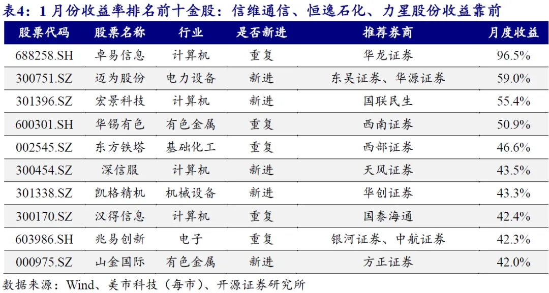 1月份卓易信息、迈为股份、宏景科技、华锡有色、东方铁塔等金股收益率排名靠前。我们统计了月度收益排名前十的金股明细,其中:卓易信息、迈为股份、宏景科技、华锡有色、东方铁塔等金股月度收益靠前,1月份收益率分别为96.5%、59.0%、55.4%、50.9%、46.6%。