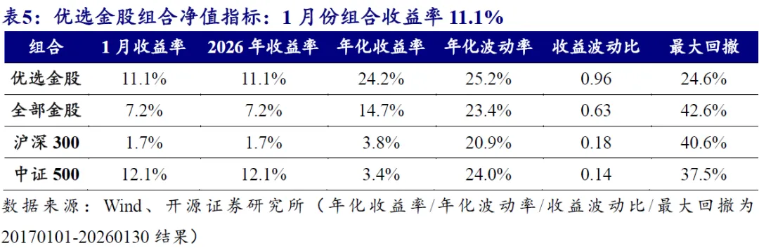 开源金工优选金股组合1月份收益率为11.1%,2026年相对中证500超额-1.0%。全历史区间内,优选金股组合年化收益率为24.2%,收益表现优于全部金股组合。优选金股组合1月份收益率为11.1%;2026年以来收益率为11.1%,2026年相对中证500超额-1.0%。