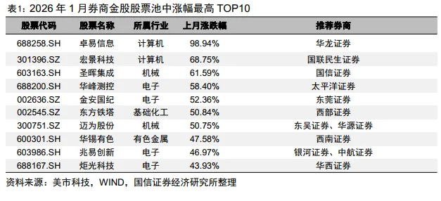 2026年1月,卓易信息、宏景科技、圣晖集成等券商金股股票的月度上涨幅度靠前。