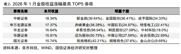 2026年1月,中邮证券、申万宏源证券、华龙证券收益排名前三,月度收益分别为18.34%、17.37%、16.64%,同期偏股混合型基金指数收益7.32%,沪深300指数收益1.65%。