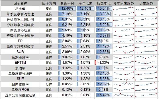 今年以来,总市值、单季度净利润增速、分析师净上调比例表现较好,盈余公告后跳空超额、单季度ROE、日内收益率表现较差。